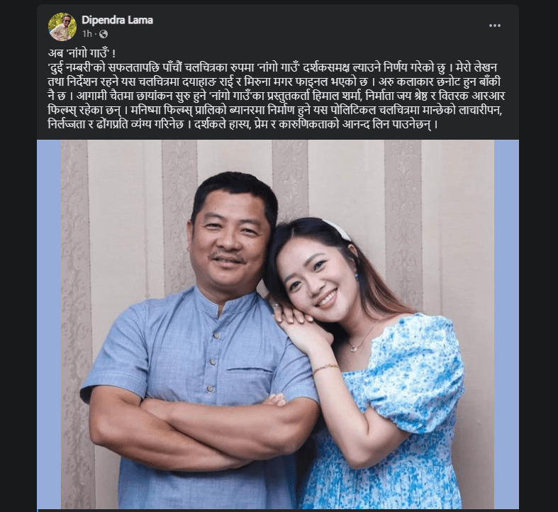 पछिल्लो समय चलचित्र दुई नुम्बरी को सफलता पछि निर्देशक दिपेन्द्र लामाको व्यस्तता पनि बढ्न थालेको छ। सामाजिक बिषय बस्तुमा आधारित रहेर कथा बुन्न माहिर निर्देशक लामाको पाचौँ चलचित्र “नाङ्गो गाउँ” निर्माण हुने पक्का भएको छ। यस चलचित्रमा मान्छेको लाचारीपन, निर्लज्जता र ढोंगप्रति व्यंग्य गरिनेछ । दर्शकले हास्य, प्रेम र कारुणिकताको आनन्द लिन पाउने लामाले आफ्नो फेसबुक मार्फत बताएका छन् । यस चलचित्रको मुख्य भूमिकामा दयाहाङ राई र मिरुना मगर फाइनल भैसकेका छन् । अरु कलाकारको छनोट हुन बाँकी नै छ । आगामी चैत देखि छायांकन सुरु हुने ‘नांगो गाउँ’का प्रस्तुतकर्ता हिमाल शर्मा, निर्माता जय श्रेष्ठ र वितरक आरआर फिल्म्स् रहने छन् । मनिष्मा फिल्म्स् प्रालिको ब्यानरमा निर्माण हुने यस चलचित्रमा लेखन तथा निर्देशन लामाको रहने छ। चलचित्र नाङ्गो गाउँ कस्तो बन्ने छ त्यो समयले नै बताउला, दिपेन्द्र लामाको निर्देशकीय पक्ष तपाइलाई कस्तो लाग्छ ?